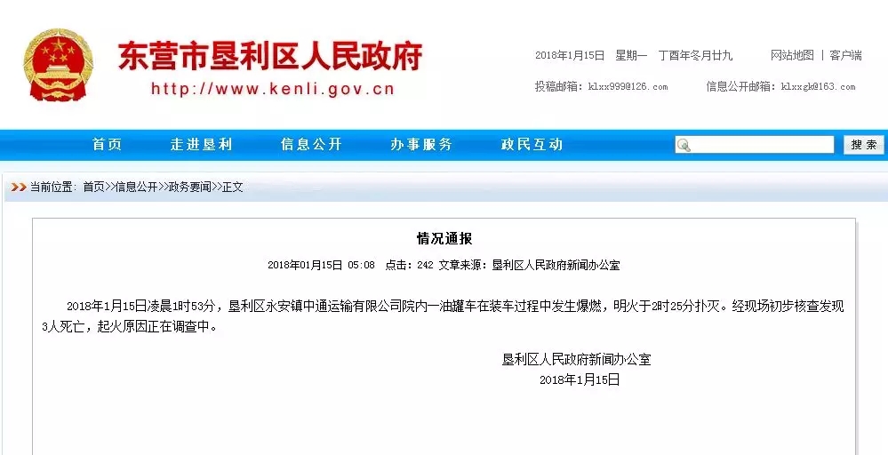 2018年1月15日凌晨1时53分,垦利区永安镇中通运输有限公司院内一油罐车在装车过程中发生爆燃,明火于2时25分扑灭。经现场初步核查发现3人死亡,起火原因正在调查中。