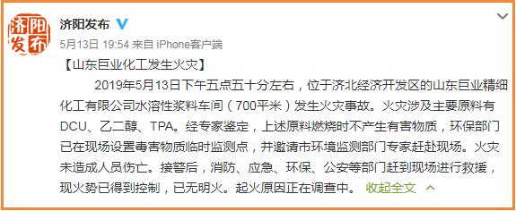山东省济南市济阳县委宣传部官方微博“济阳发布”发布消息,2019年5月13日下午五点五十分左右,位于济北经济开发区的山东巨业精细化工有限公司水溶性浆料车间(700平米)发生火灾事故。