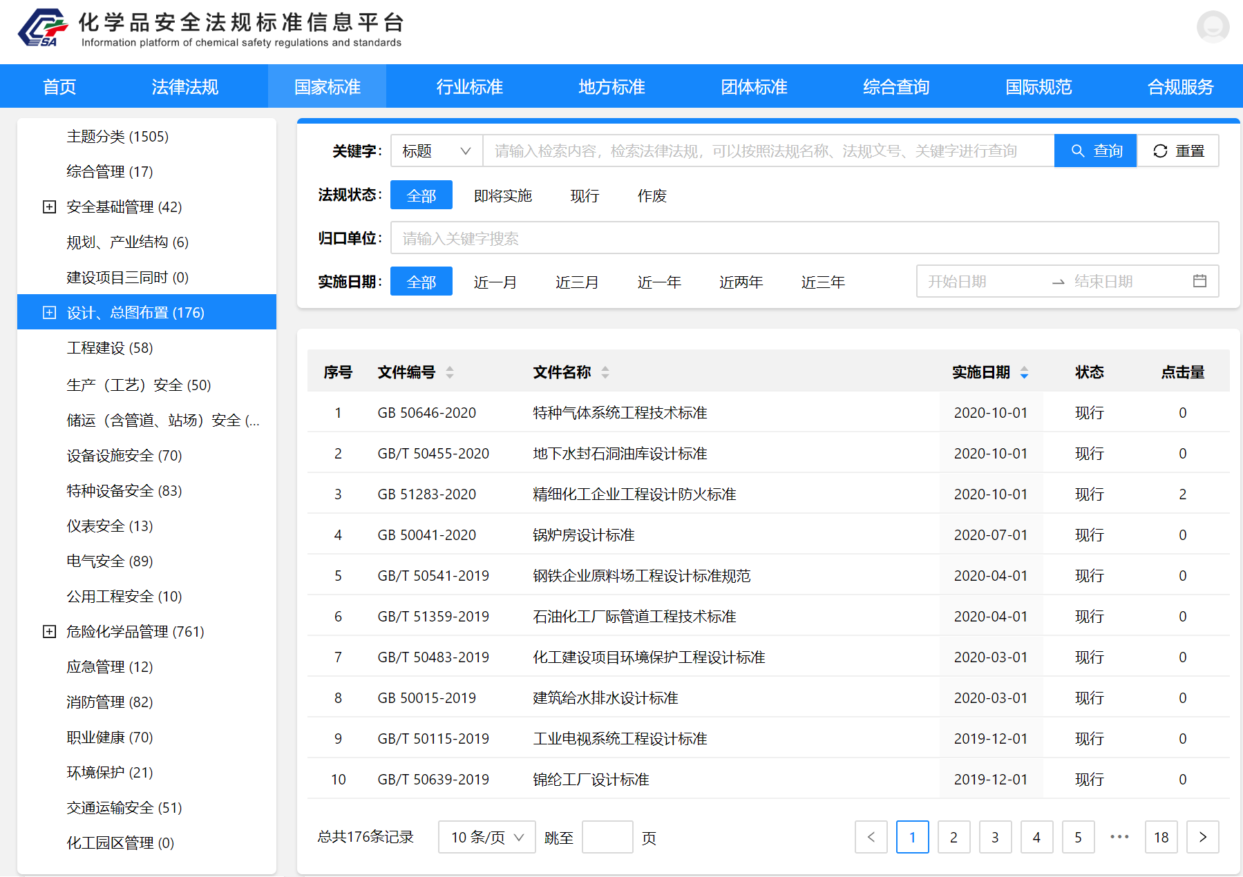 截至目前,平台共收录3197条法规/标准信息,其中法律法规383条、国家标准1505条、HG行业标准1082条、AQ行业标准165条、北京地方标准57条、协会团体标准5条。平台具备多条件查询、智能分词、关联查询等功能,方便用户快速检索;目前设置了法规标准查询、法规标准动态、法规标准宣贯等板块,后续将继续开发国际规范、合规服务等板块,并不断完善各项功能。