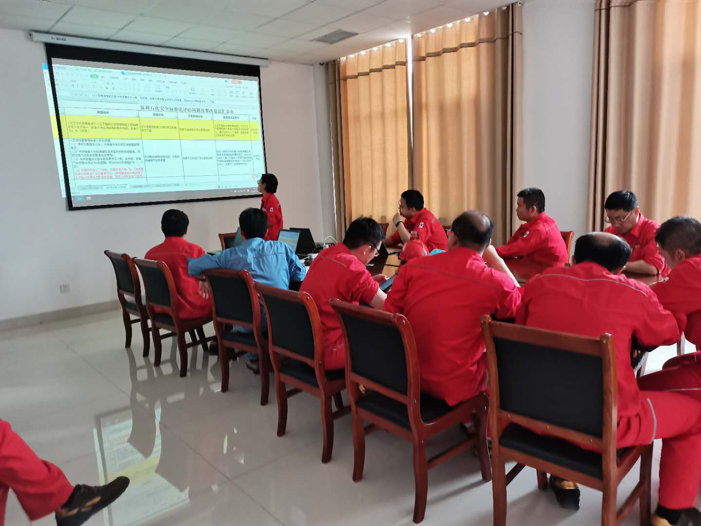 专家利用4天时间,分别到生产技术部、设备科、安环部与部门管理人员进行年初评估问题的整改跟踪、根因分析、解疑答难;并以优秀实践为例,解析公司目前安全管理体系中存在的瓶颈问题,讨论了重点工作之一---目标和指标管理提升方案,并对试点车间人员进行了培训和讲解。专家还与企业分管工程师结合山东省及东营市危险化学品安全专项整治三年行动实施方案,制定了下半年咨询工作重点任务和方向。