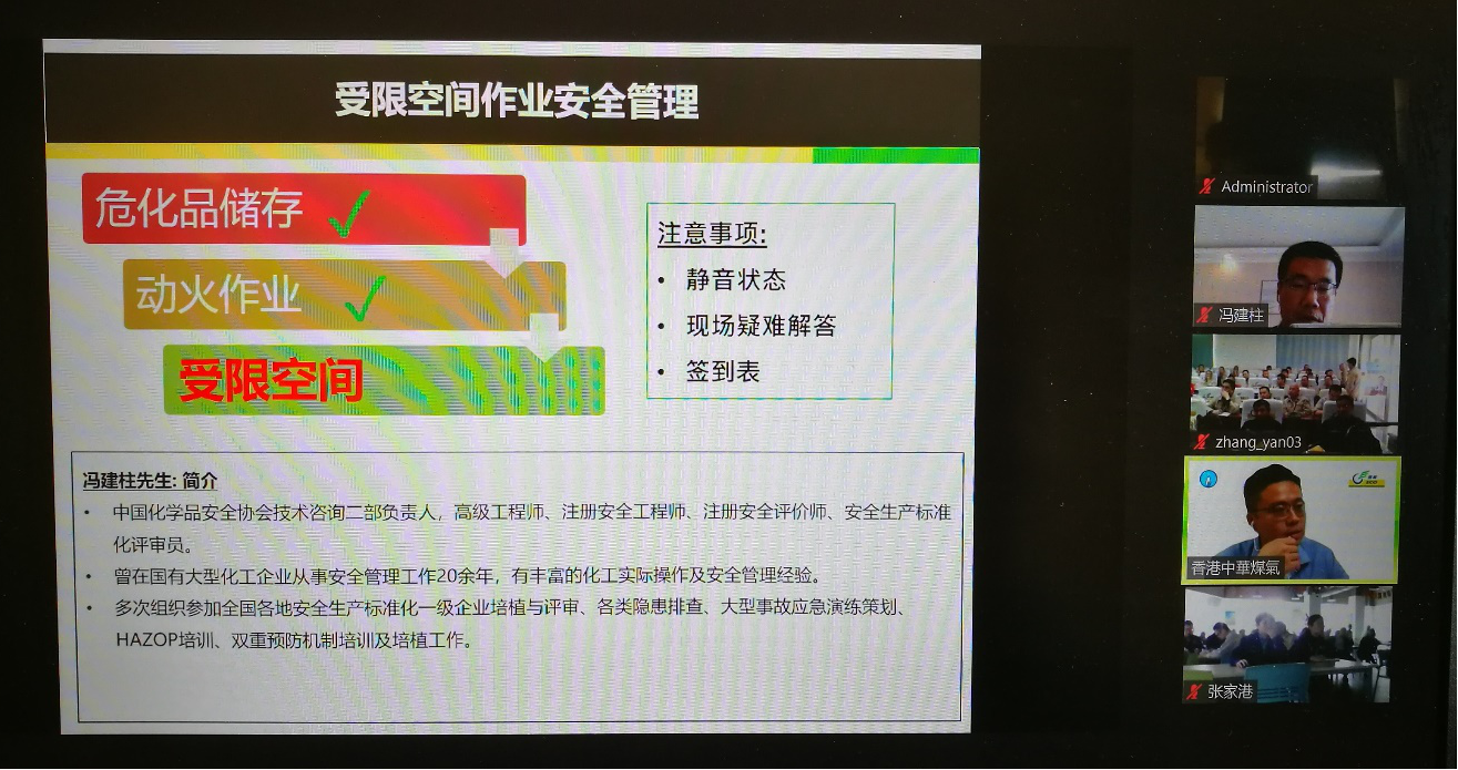 4月8日,根据协会培训教育部的工作安排,协会专家冯建柱对香港中华煤气-易高集团进行了受限空间作业安全管理线上培训,企业十余个下属单位的100余人参加了培训。