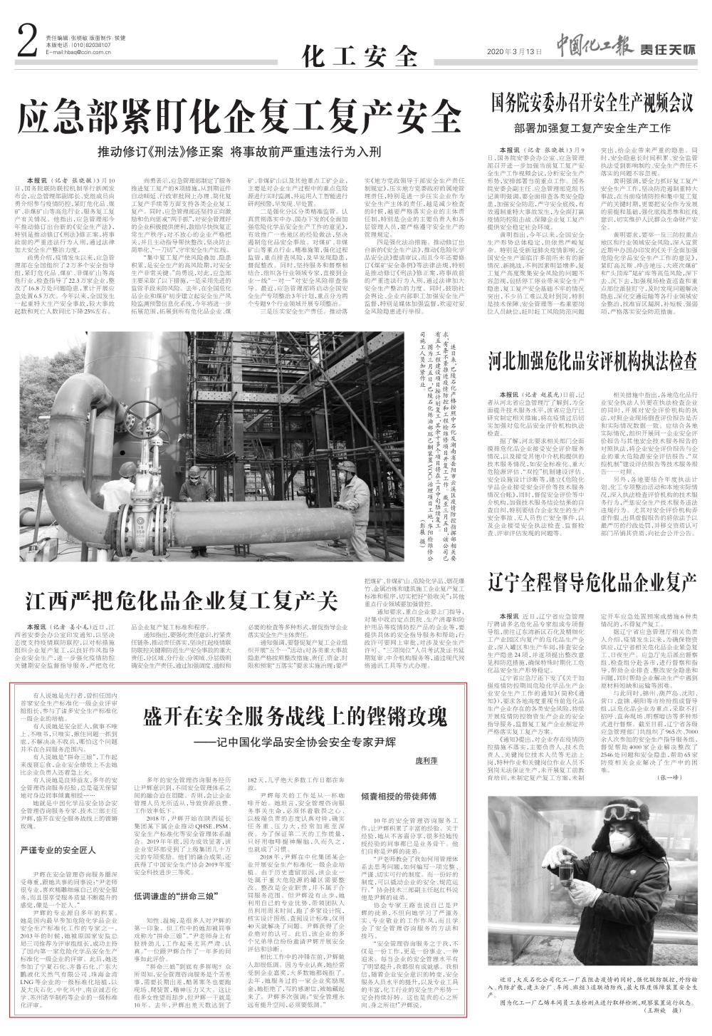 2020年3月13日出版的《中国化工报·责任关怀周刊》化工安全版对中国化学品安全协会专家尹辉进行了深度报道。全文如下: