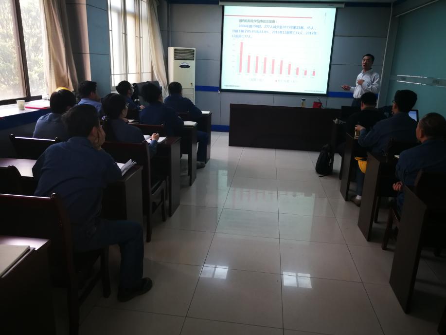 4月9日,史总作了题为《企业安全文化》、《事故事件管理》两场培训。4月10日,史总分别深入现场到生产装置外围及油品部、运行二部等,查看企业生产设施与周围设施的安全距离情况及生产现场的安全管理情况,并指出与安全标准化一级达标所存在的差距,如高架火炬与南侧公路的防护距离;动火作业风险分析、标识等问题。培植期间,史总与杜邦给企业做安全管理提升工作提出了建议。