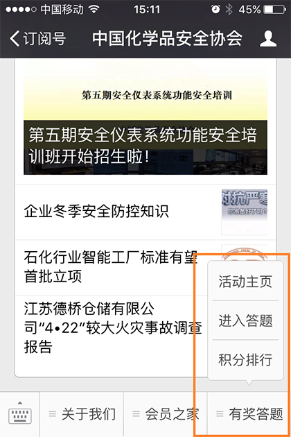 为进一步增强中国化学品安全协会影响力,扩大协会微信公众号知名度,推广化学品安全知识,11月3日起,协会微信公众平台进行升级改版,新增“有奖答题”和“视频库”功能模块,以增强平台的互动趣味性。