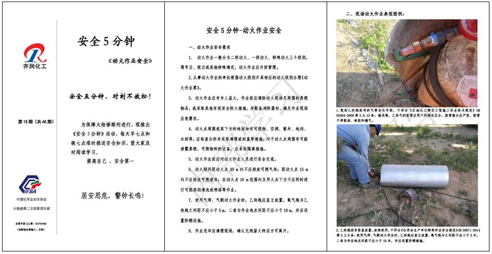 在装置停工前,协会组织炼化专家,对齐润化工停工方案进行评审,从工艺安全、设备安全的专业角度,完善停工阶段的风险管控措施。在检修开始前,协会组织承包商开展安全培训、监护人安全培训、管理人员安全专项培训等,累计培训承包商1530人次,企业员工1928人次,通过横向到底、竖向到边专业培训,提升承包商、企业员工的安全意识与安全技能,为安全检修打下了坚实的基础。检修开始后,协会将监督工程师分成5个督察组,分区域进行检修过程的风险管控。5个督察组组从早上7:00到达检修现场,晚上21:00才离厂,全天候对检修过程进行安全督察。同时,为保障大检修顺利进行,提高企业全员的安全意识和安全技能,协会组织优势力量编制《安全5分钟》期刊,并于每天早七点和晚七点准时推送给企业。