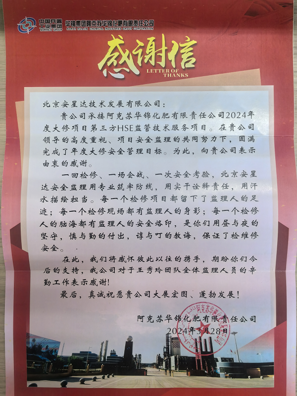 3月28日,北京安星达技术发展有限公司收到阿克苏华锦化肥有限责任公司赠送的“技术精湛 行业典范”锦旗和感谢信,感谢安星达为阿克苏华锦化肥公司2024年度大检修安全施工保驾护航。