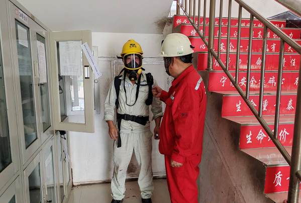 图为专家在检查企业员工正压式空气呼吸器佩戴情况