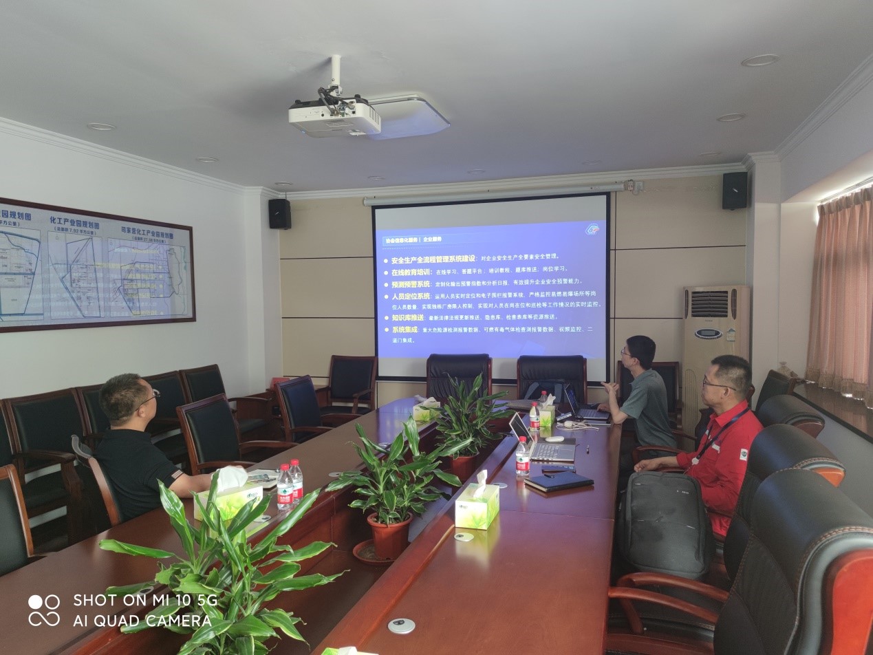 韩主任通过了解安监平台运行并与第三方交流,初步掌握了基本情况,同时通过PPT形式,向属地介绍安监平台的架构、功能及展示平台运行效果。