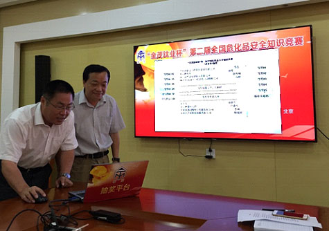 中国化学品安全协会副理事长、秘书长路念明与中国化工报社社长崔学军共同为竞赛抽取一等奖 9月2日,金茂钛业杯第二届全国危险化学品安全知识竞赛读者奖抽奖仪式在北京举行。中