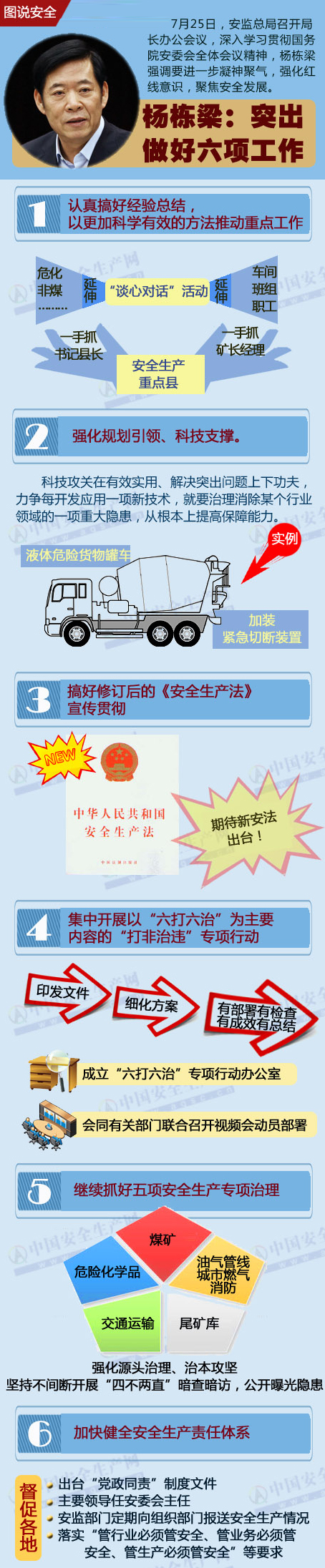 杨栋梁强调,下一步,总局、煤监局各司局要以习近平总书记、李克强总理关于安全生产重要论述为指导,紧紧围绕贯彻落实国务院安委会全体会议精神,进一步凝神聚气,强化红线意识,聚焦安全发展,突出做好以下工作: