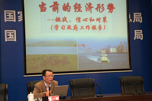 王一鸣紧紧围绕当前经济形势,运用大量实例和数据,作了题为《当前经济形势--面临的挑战、信心和对策》的辅导报告。报告围绕学习《政府工作报告》,从当前的经济形势和面临的挑战,全球经济调整和我国经济走势,短期政策:扭转经济下滑趋势,中期战略:推进经济转型升级四个重要方面进行深入阐释。