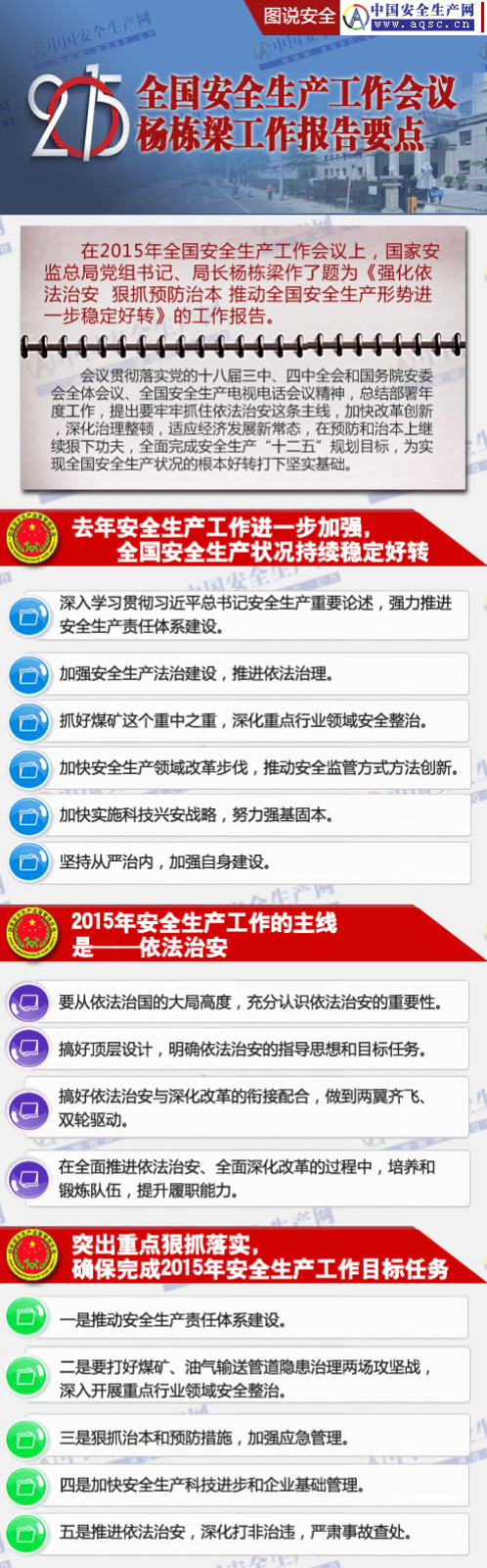 杨栋梁提出,2015年要突出抓好五项重点工作:一是推动安全生产责任体系建设;二是要打好煤矿、油气输送管道隐患治理两场攻坚战,深入开展重点行业领域安全整治;三是狠抓治本和预防措施,加强应急管理;四是加快安全生产科技进步和企业基础管理;五是推进依法治安,深化打非治违,严肃事故查处。