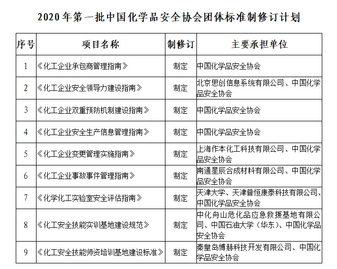 4月7日,中国化学品安全协会印发2020年第一批团体标准项目计划,共9项标准,计划在今年底前完成标准发布工作。