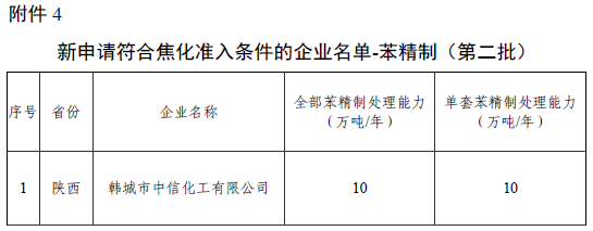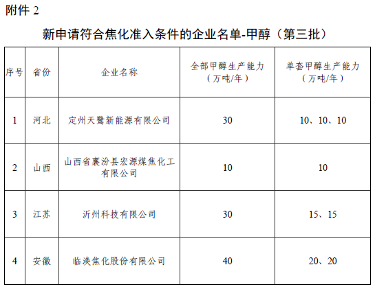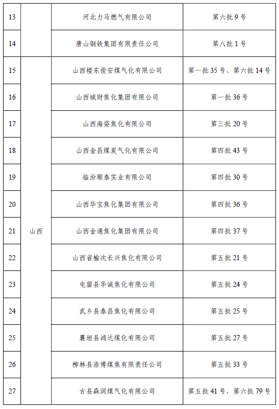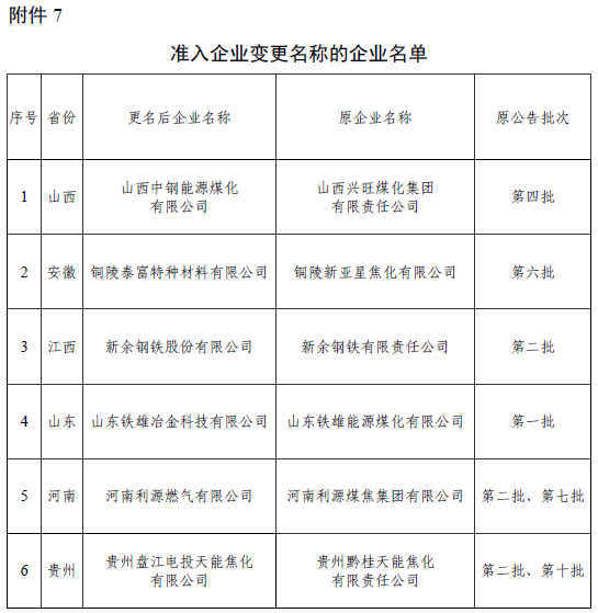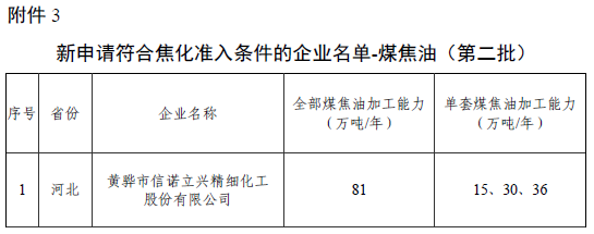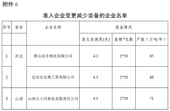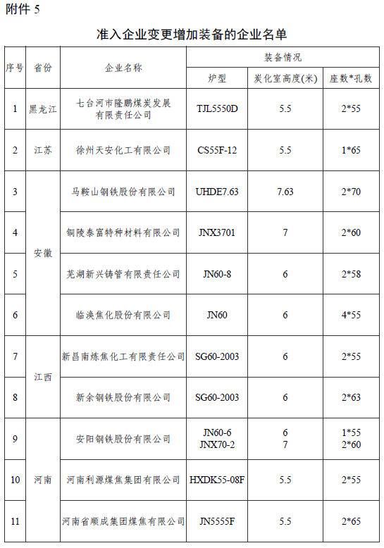 根据《焦化行业准入条件(2014年修订)》和《焦化生产企业公告管理办法》,工业和信息化部开展了焦化准入企业动态调整工作。其中9家焦炭生产企业、4家甲醇生产企业、1家煤焦油深加工企业、1家苯精制生产企业列入新申请准入公告企业名单;11家准入企业变更装备增加、3家准入企业变更装备减少、6家准入企业变更名称;根据地方工业和信息化主管部门建议,40家企业撤销准入公告。