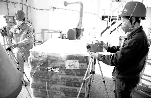 图为8月12日,该公司技术监测人员正在树脂联合车间粉尘检测点监测。 (彭展 摄)