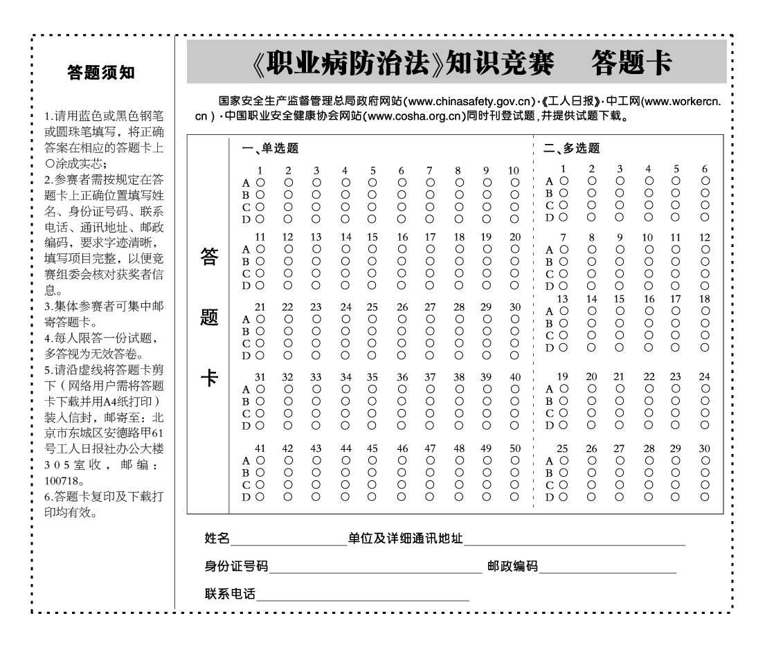 (二)请各参赛单位将本单位的答题卡(答题具体要求见试卷)收集后统一寄至竞赛组委会办公室(地址:北京市东城区安德路甲61号工人日报社305室收,邮编:100718)。