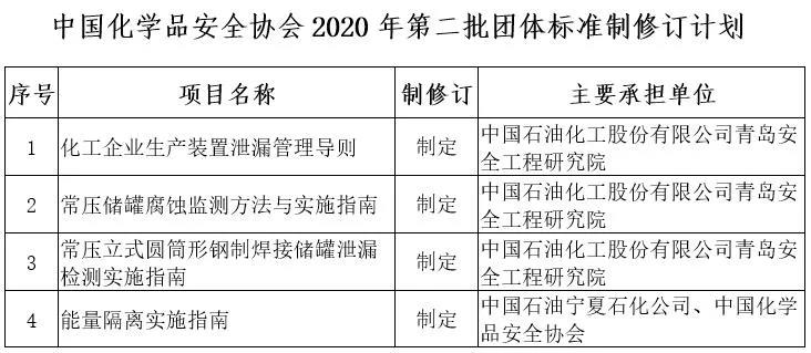 6月28日,中国化学品安全协会印发2020年第二批团体标准项目计划。本批修订计划共涵盖4个项目,其中3项为泄漏管理相关标准项目,1项为能量隔离相关标准。