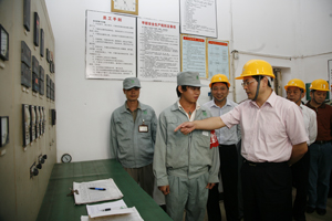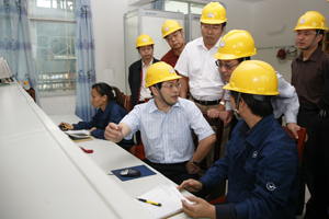 10月26日,国家安全监管总局党组成员、副局长孙华山在华亿化工有限公司中控室向安全监督管理员了解情况。 |