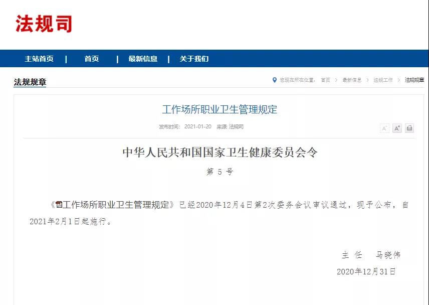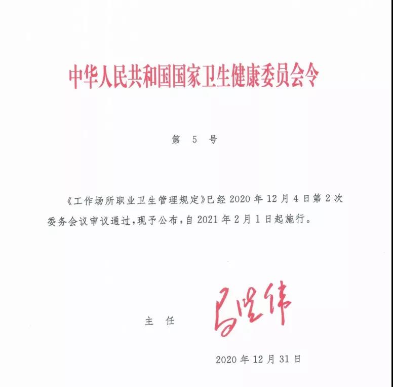 第六十条 本规定自2021年2月1日起施行。原国家安全生产监督管理总局2012年4月27日公布的《工作场所职业卫生监督管理规定》同时废止。