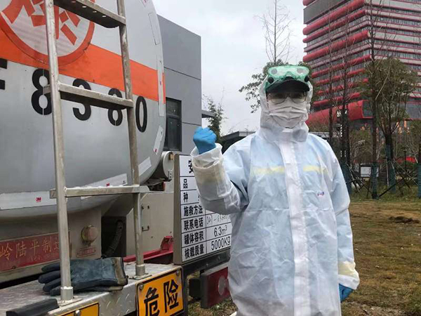 图为中国石油湖北销售武汉分公司宏图大道站经理马婷全副武装为武汉客厅方舱医院配送柴油(施馨淇 摄)