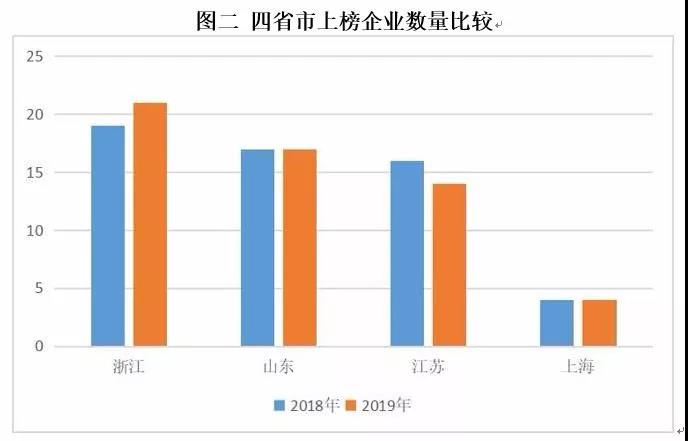 江苏省今年的上榜企业数为14家,比去年少了2家。其中,落榜4家:康得新复合材料集团股份有限公司、江苏亚邦染料股份有限公司、江海环保有限公司、金陵华软科技股份有限公司;新上榜 2 家:江苏华伦化工有限公司、苏州世名科技股份有限公司。从整个榜单来看,江苏上榜的14家企业中有9家都在后50名,前10名中也没有看到江苏企业的身影。具体分析,江苏精细化工产业呈现下滑趋势的原因有三方面:一是近几年国际石油、煤炭等能源价格日益攀升,但江苏传统的精细化工多为石油产业的衍生品或精加工产品,随着原材料价格的增长,利润空间逐年缩小。二是江苏省的精细化工企业多为农药类、颜料类、涂料类企业,此类企业污染较重。近几年,国家安全环保监管日益趋严,加大了对安全环保的监督检查力度,江苏很多企业因此停产整顿。三是受响水天嘉宜化工有限公司“3·21”特别重大爆炸事故影响,江苏省2019年安全生产形势尤为严峻,全省多次进行专项安全检查,很多企业不断进行升级改造,淘汰落后产能,加大技术投入,致使很多上市企业财务数据出现下滑。