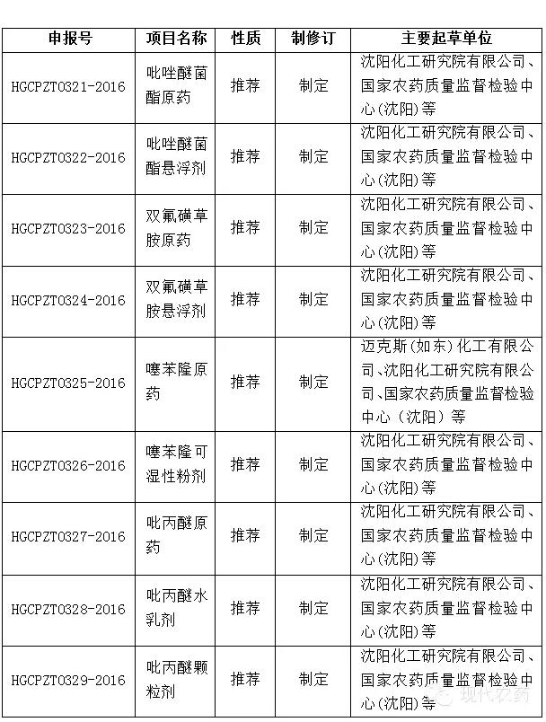 2月17日,工业和信息化部科技司将申请立项的290项行业标准计划项目予以公示,截止日期为2016年3月18日。有关方面如对拟立项标准项目有不同意见,可在公示期间填写《标准立项反馈意见表》并反馈至工信部科技司。其中,包括以下9项农药产品类化工行业标准,拟完成年限均为2018年。