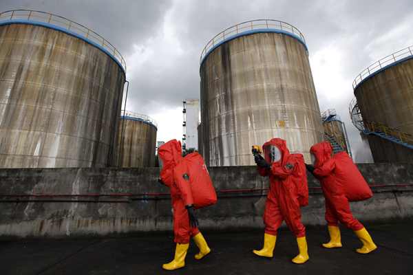 “8·12”天津港爆炸事故后,全国各地陆续开展了危化品整治及消防应急处置演练工作。图为8月17日,广西柳州一处危化品仓储举行爆炸处置演练。新华社供图