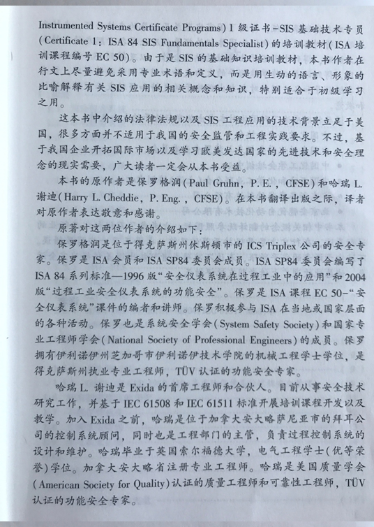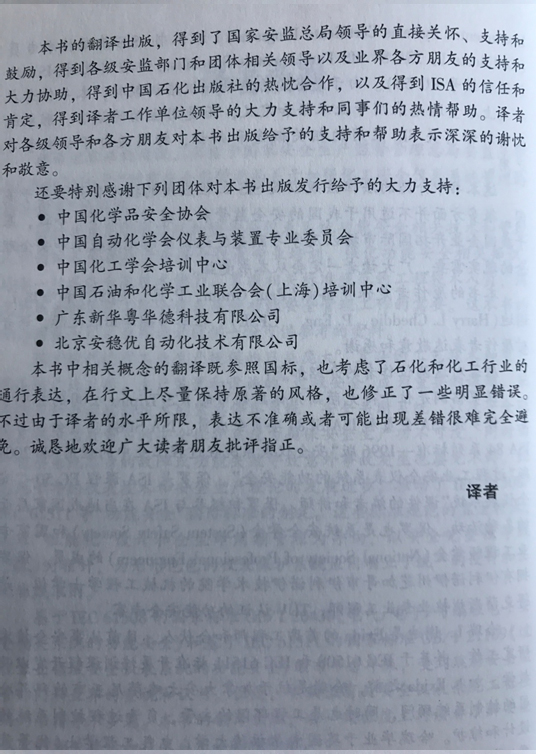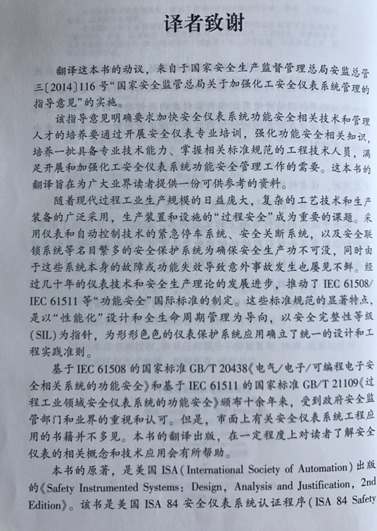 本书原著由美国ISA出版,对安全仪表系统的设计、工程实践和维护具有指导作用,